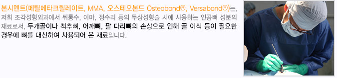 메틸메타크릴레이트 성분은 이미 1940년부터 인체에 사용되어 왔으며, 주로 두개골 등의 손상으로 결손부위가 생기거나, 선천적 이상으로 두개골 조직이 부족할 때에 자가 골조직 이식이 불가능한 경우에 사용되었습니다.